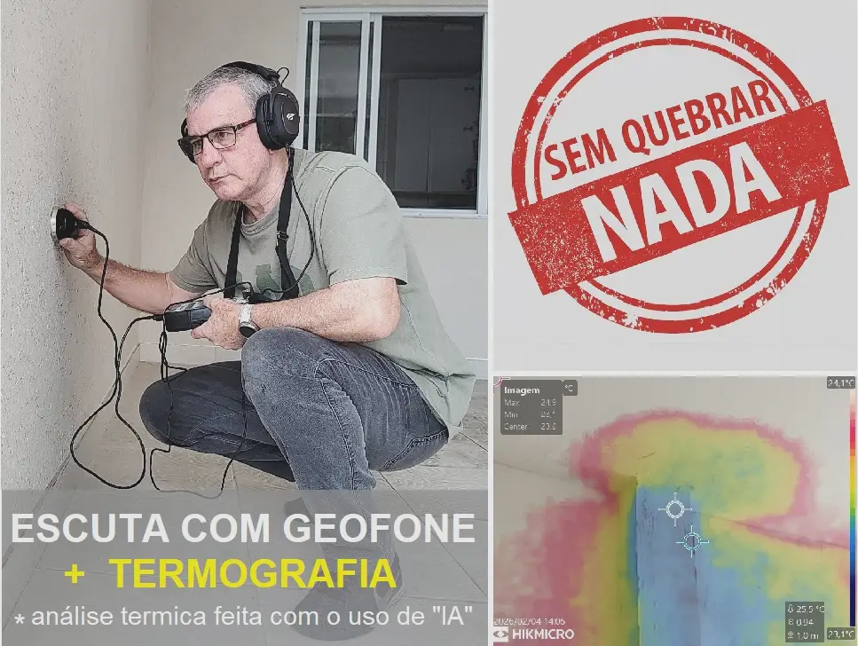 Para isso, serão utilizados equipamentos eletrônicos profissionais de alta precisão. Entre eles estão o geofone digital, a câmera termográfica — também conhecida como termovisor — além de um sensor de umidade.